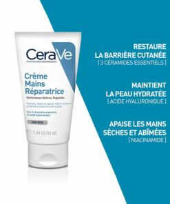 La Crème Mains Réparatrice CeraVe est formulée pour prendre soin des mains exposées aux agressions quotidiennes (lavages fréquents, froid, travaux manuels) et dont la barrière cutanée est fragilisée. Enrichie en céramides essentiels (1, 3, 6-II) pour restaurer les lipides cutanés, en acide hyaluronique pour retenir l’eau dans l’épiderme et en niacinamide pour apaiser les sensations de tiraillement, elle agit efficacement pour réparer et protéger. Grâce à la technologie MVE® (libération prolongée des actifs), elle assure une hydratation durable jusqu’à 24 h.