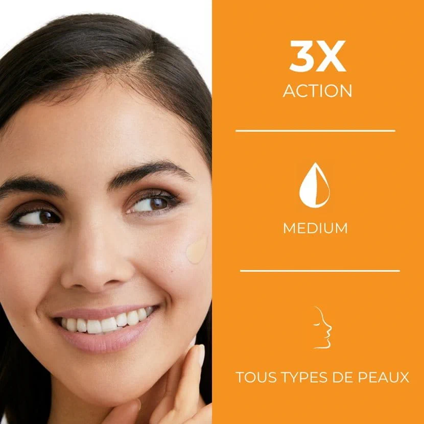 Oxydes de fer + pigments correcteurs : unification immédiate teinte Medium, aide contre la HEVIS.
